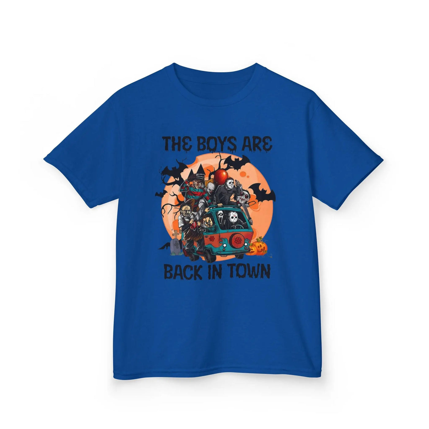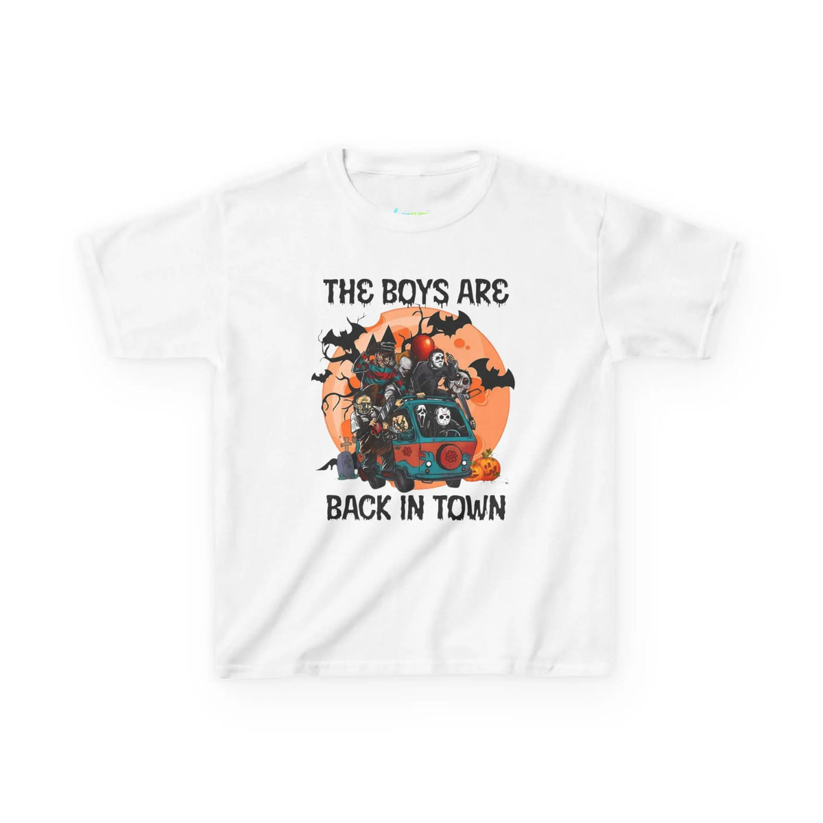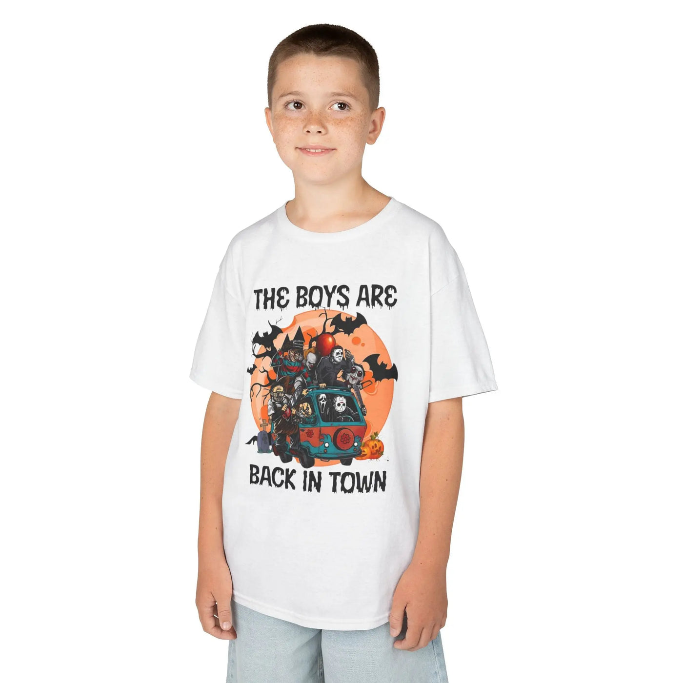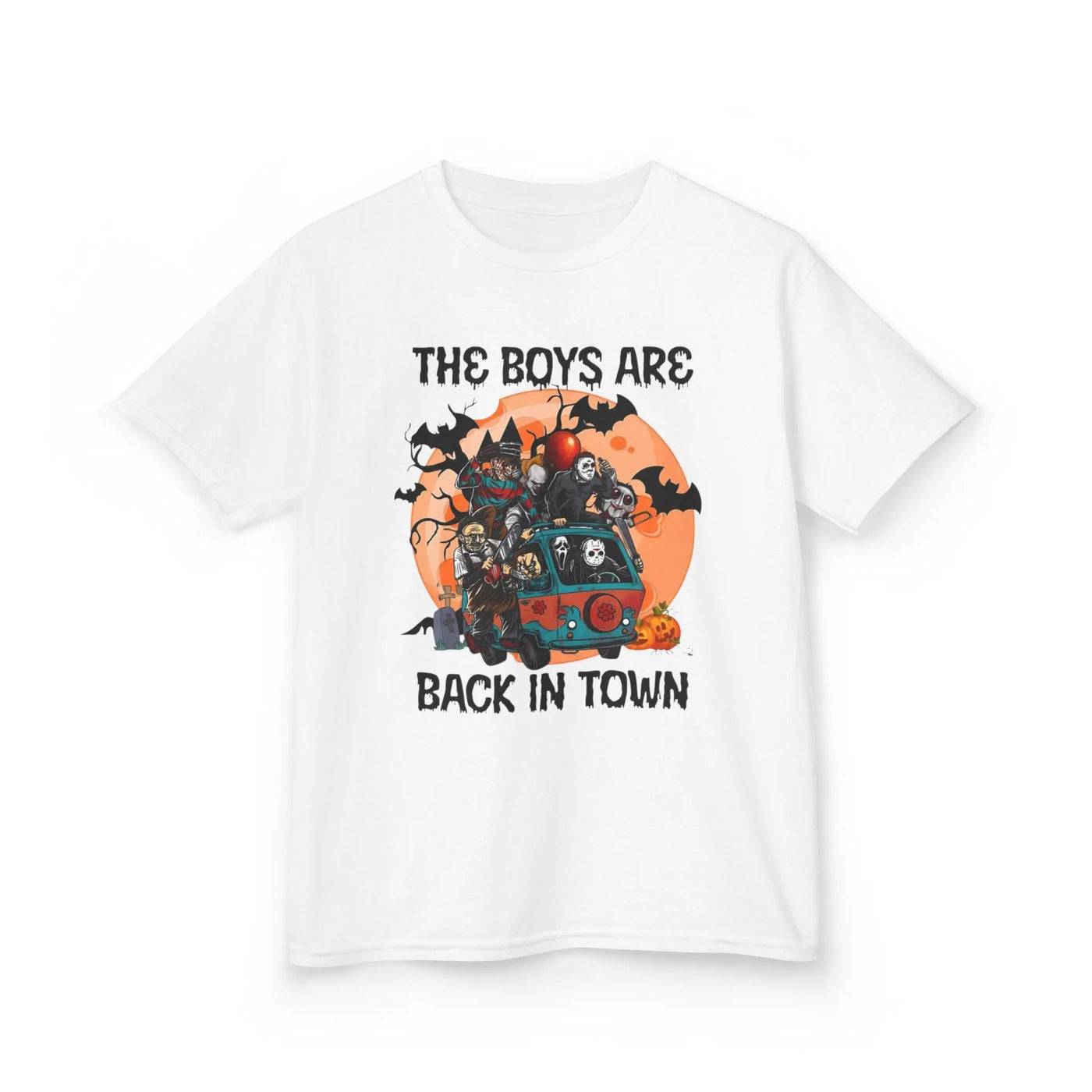 The Kids Halloween T-Shirt features a fun and festive design that shouts, 'The Boys Are Back in Town!' This catchy slogan captures the spirit of Halloween, making it an ideal choice for young boys who want to celebrate this thrilling season. The graphic is vibrant and eye-catching, ensuring your child stands out in any crowd. Not only is this shirt stylish, but it also adds to the festive atmosphere, inviting smiles and joy from everyone around. Therefore, if you're looking for a shirt that blends fun with Halloween spirit, this T-shirt is a perfect choice.