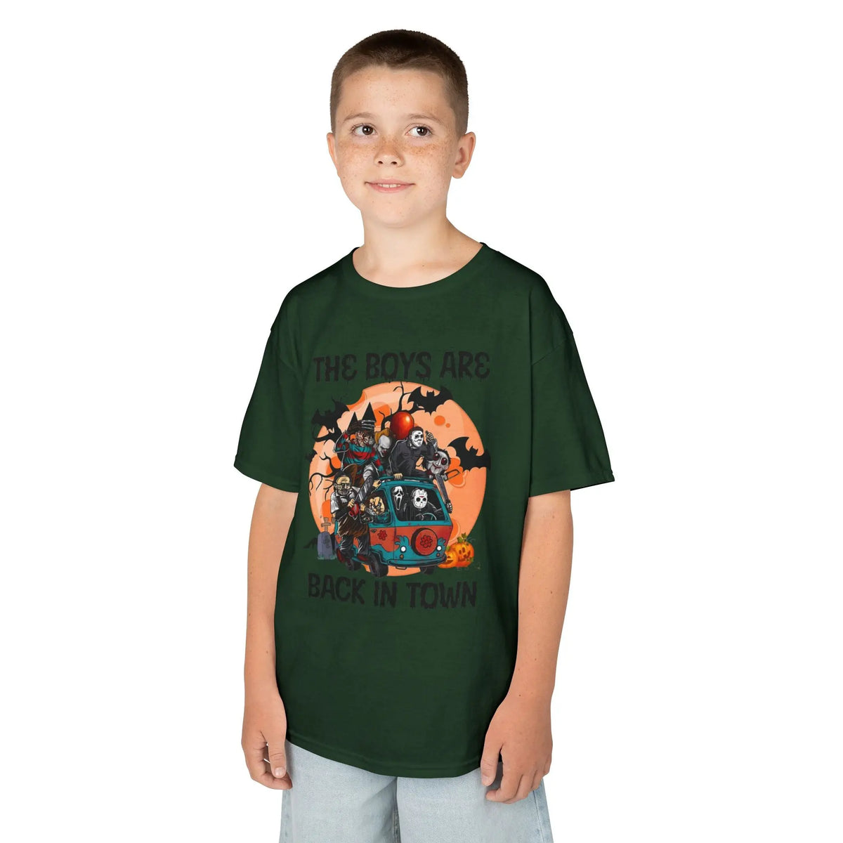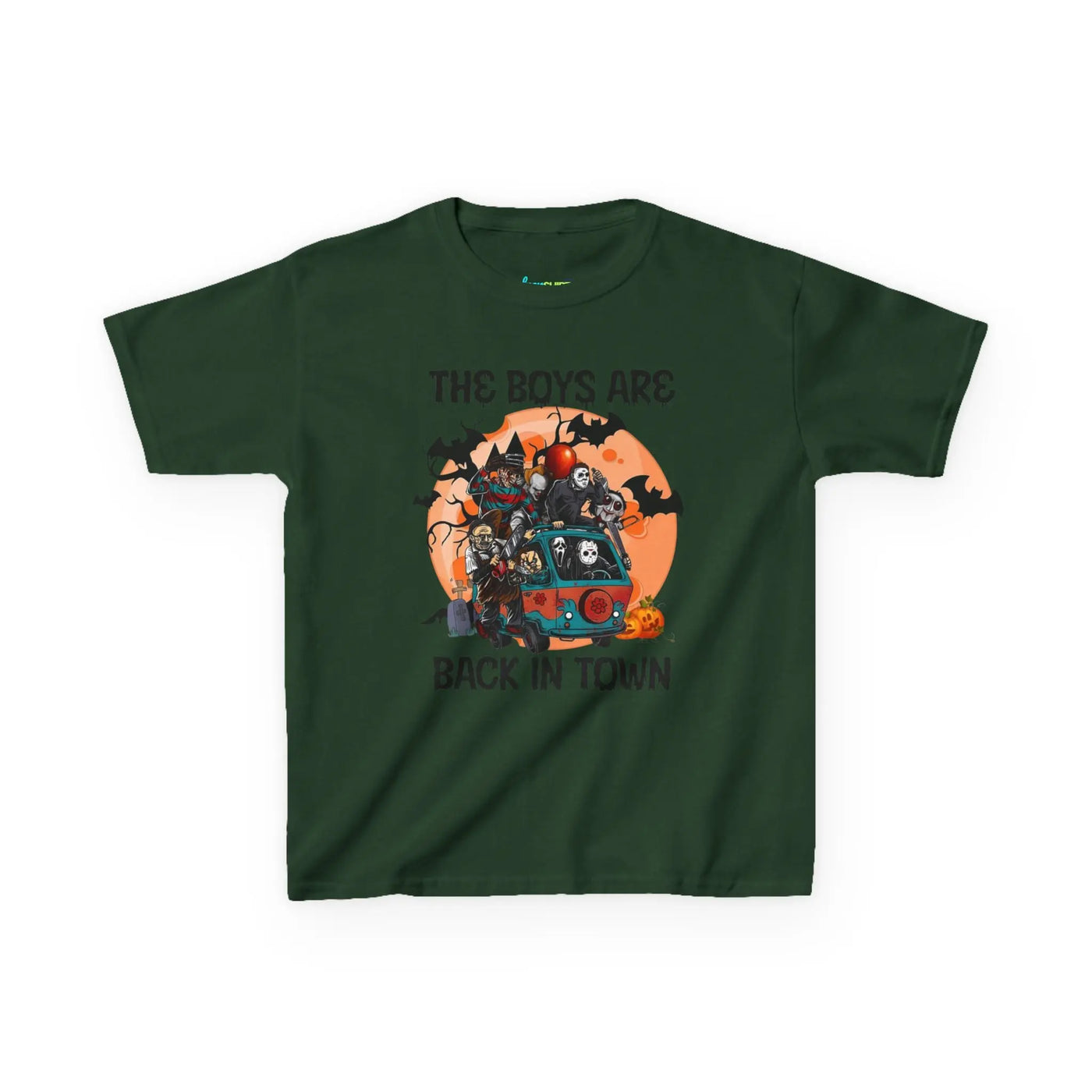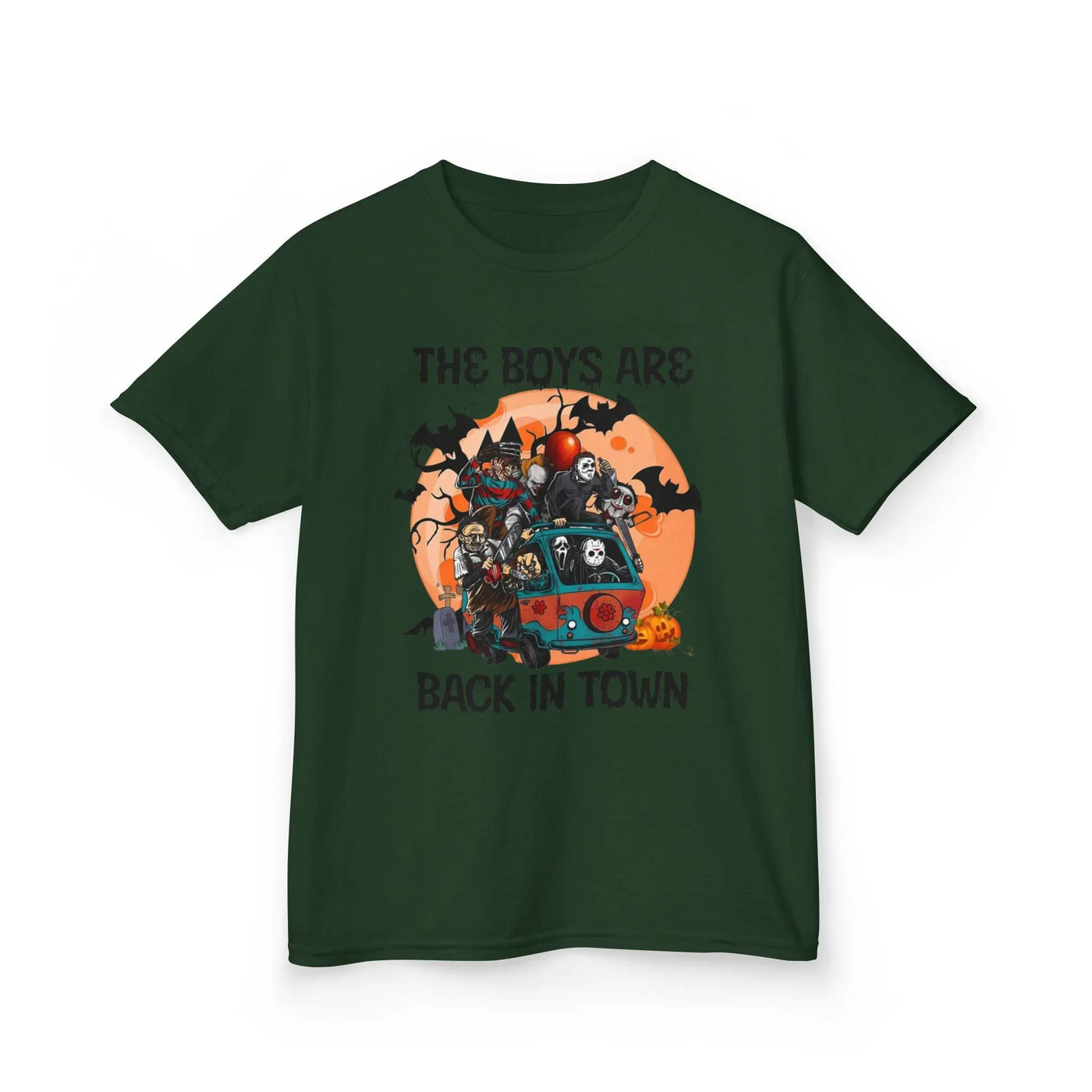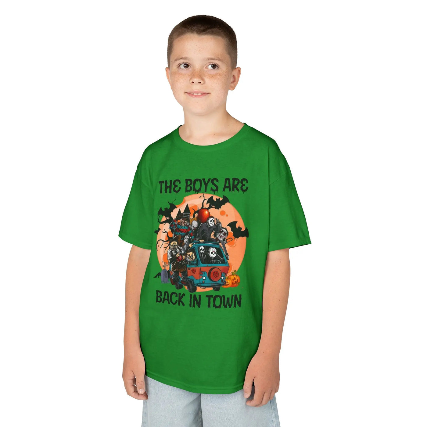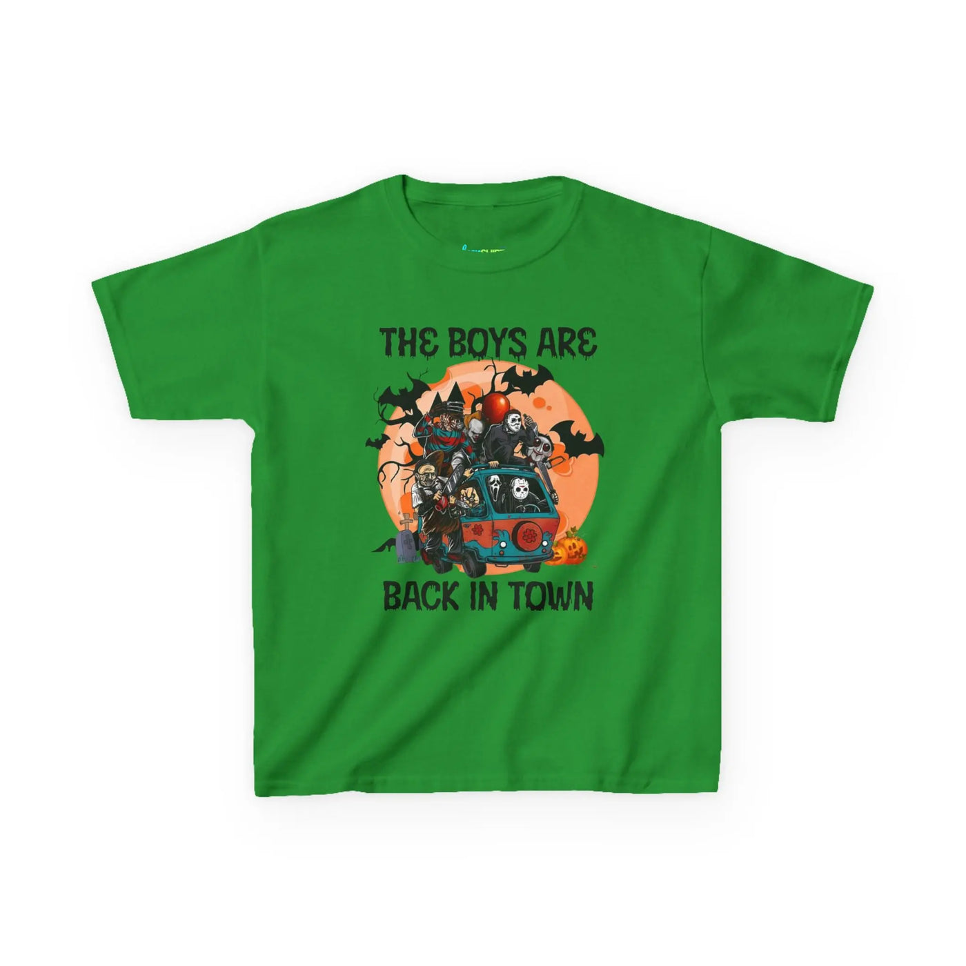 The Kids Halloween T-Shirt features a fun and festive design that shouts, 'The Boys Are Back in Town!' This catchy slogan captures the spirit of Halloween, making it an ideal choice for young boys who want to celebrate this thrilling season. The graphic is vibrant and eye-catching, ensuring your child stands out in any crowd. Not only is this shirt stylish, but it also adds to the festive atmosphere, inviting smiles and joy from everyone around. Therefore, if you're looking for a shirt that blends fun with Halloween spirit, this T-shirt is a perfect choice.